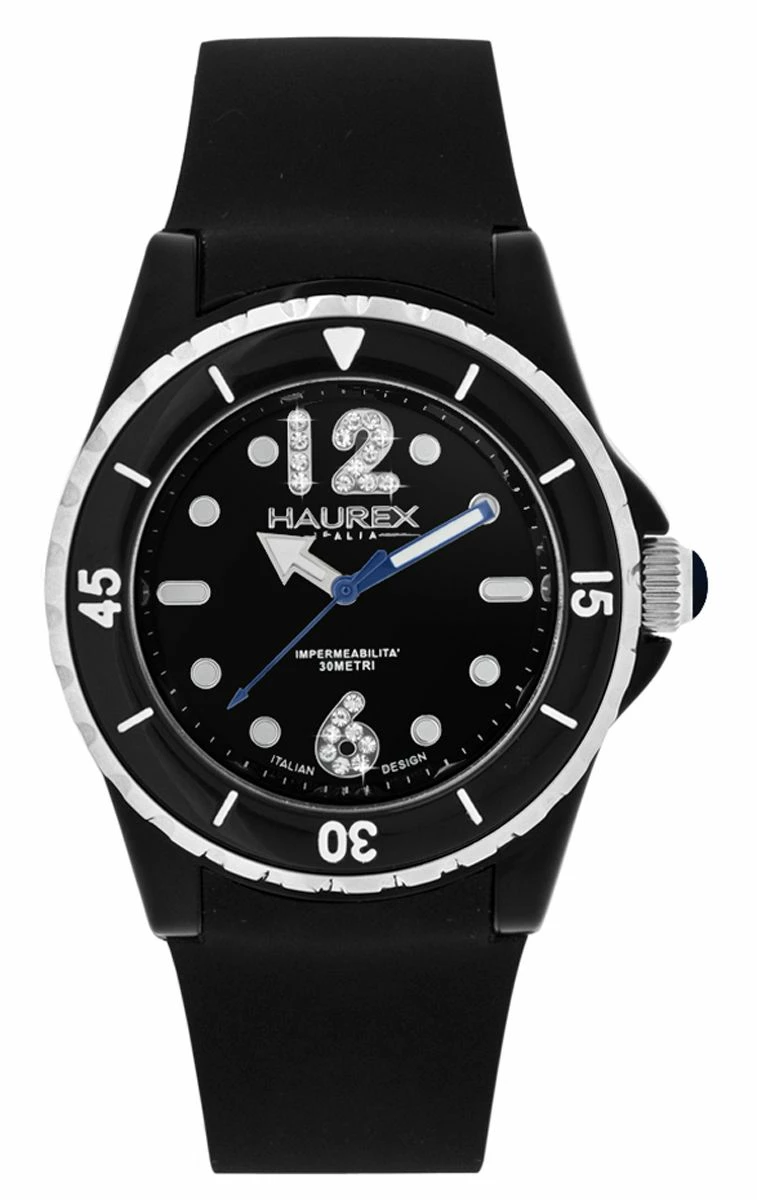 Haurex Quartz Dial color Black Watch # PN379DNS (Women Watch). Model Number:PN379DNS PN379DN PN379D PN379. Movement Type : Quartz. Water Resistant Depth : 30 meters. Crystal : Mineral. Bezel Function : Unidirectional. Bezel Material : Stainless Steel. Clasp Type : Buckle. Case Material : Plastic. Band Width : 23 millimetres. Case Size Diameter : 36 millimetres. BandLength : Women Standard. Case Size Thickness : 13.5 millimetres. Band Material : Silicone. Item Shape : Round Shape. Display Type : Analog. Dial Color : Black. Band Color : Black.