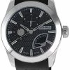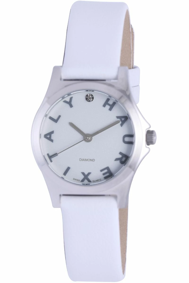 Stainless steel watch featuring round white dial with diamond marker at 12 o’clock and “Haurex Italy” logo displayed as hour markers. Quartz movement with analog display. Mineral crystal dial window. Features buckle closure, fluted crown, logo on crown, and smooth leather band. Water-resistant to 30 m (99 ft).